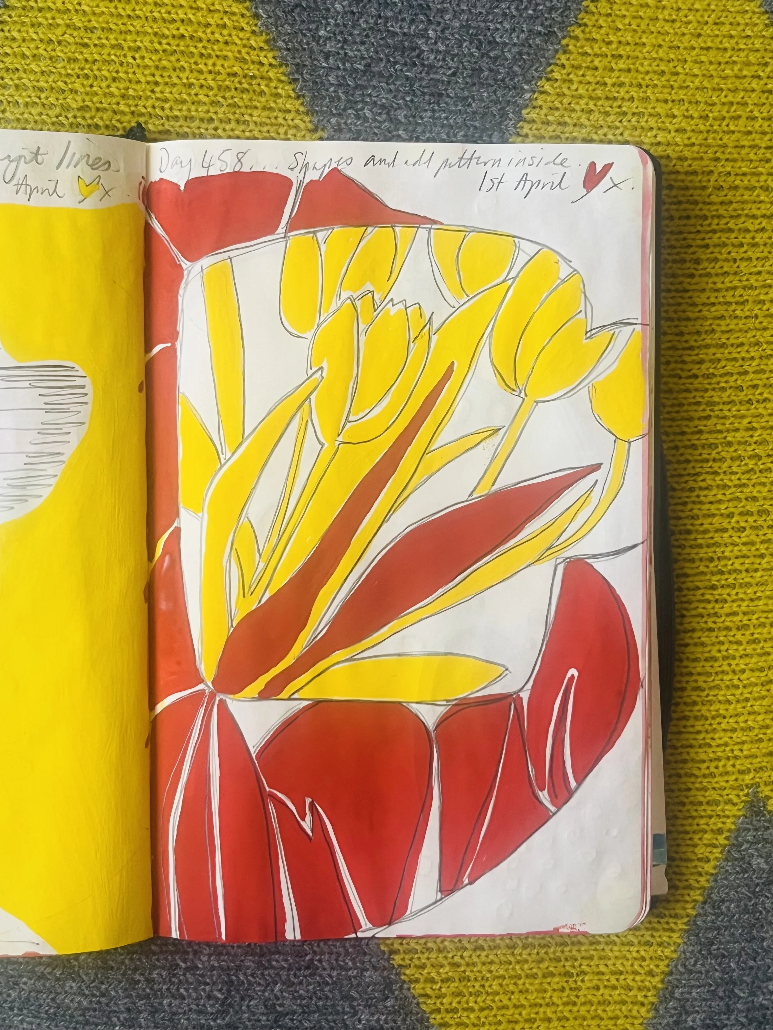 One drawing from this practice, Tulips Day 458, has become the starting point for a new textile design. It was created on day eight of the list, with the prompt “Shapes and add pattern inside.” I drew the simple outline of my tea mug resting on the table before me, then filled it with tulips I had seen blooming during my morning run & a bunch at home - a quiet merging of observation, memory, and seasonal change.