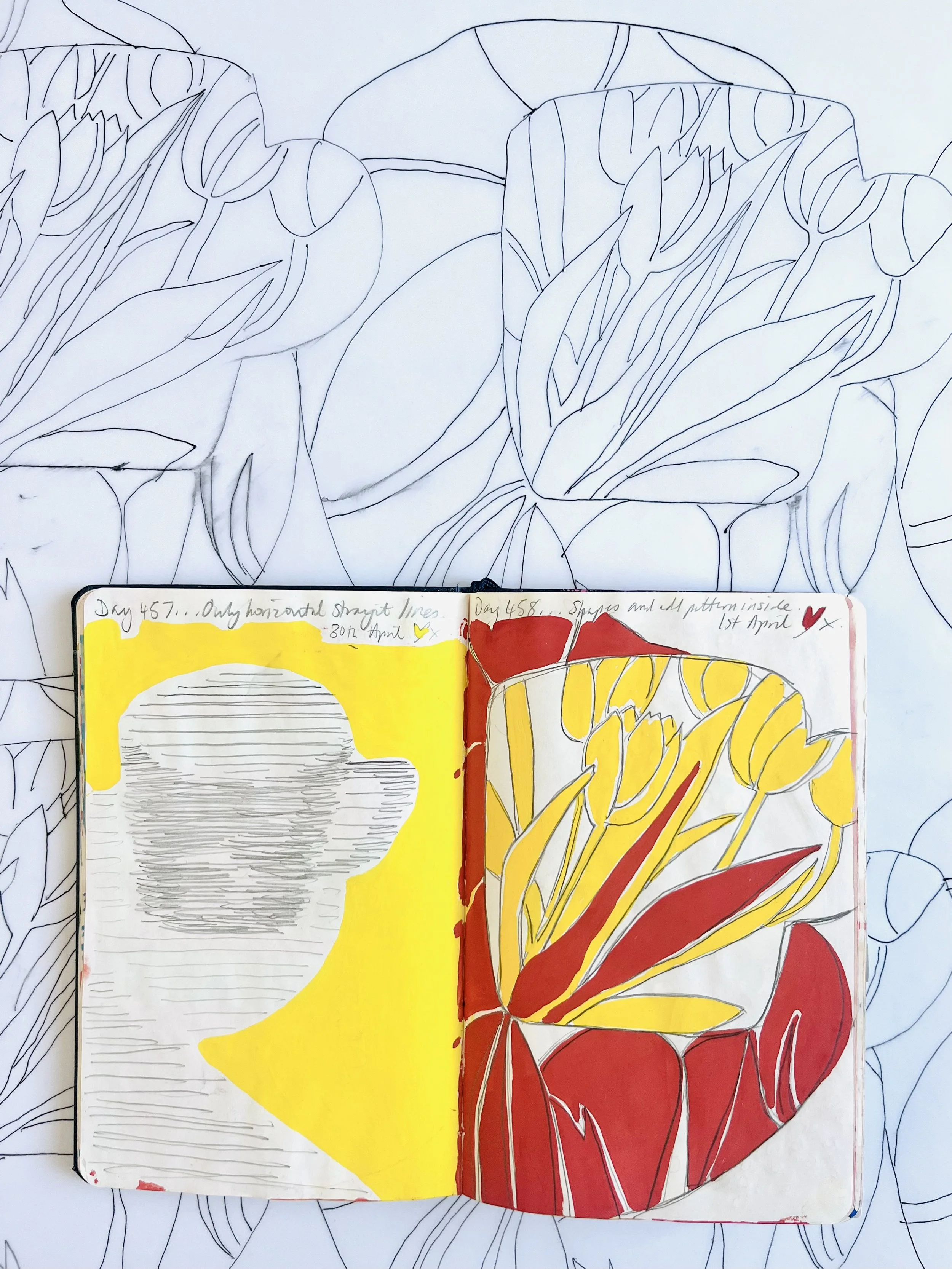 What begins as a five-minute morning sketch slowly transforms — through tracing, repetition, layering, and colour — into a textile designed to live within interiors.