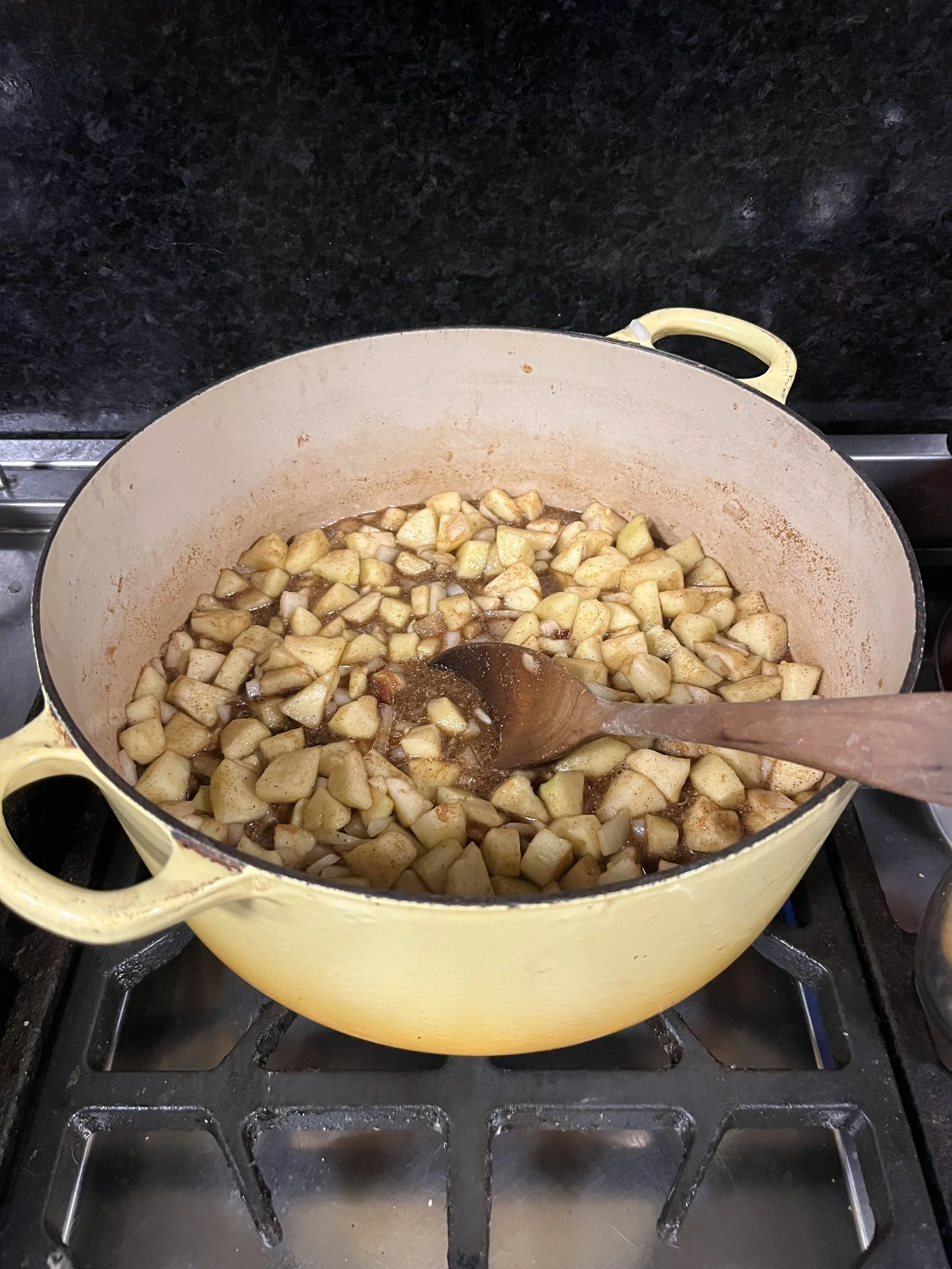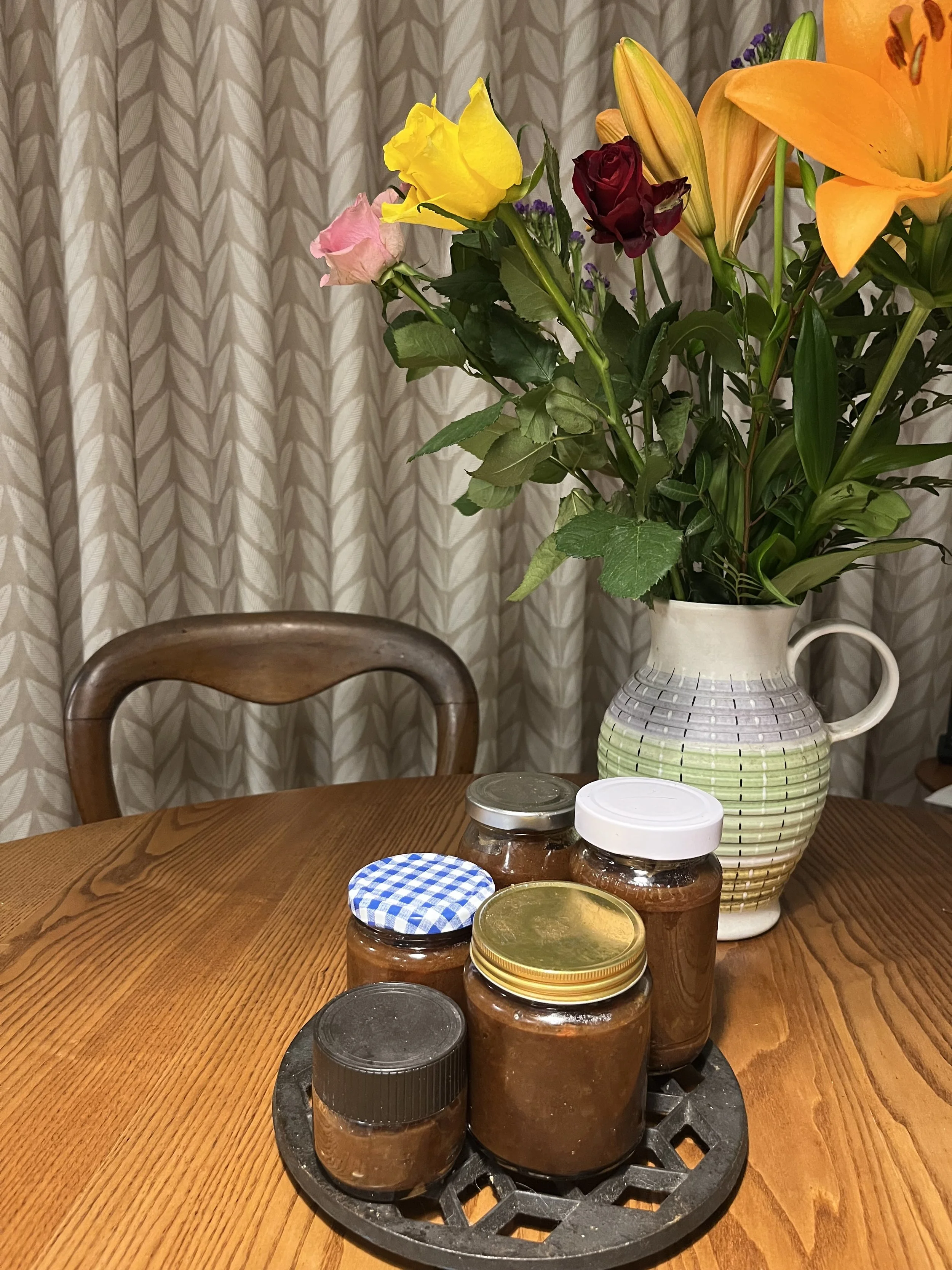 It’s been a bumper year for apples in my mum’s garden—the two trees right next to my studio have been showing off for weeks. Last night we finally surrendered to the abundance and had a batch-cooking evening together: mountains of chopped apples, lots of cinnamon, and… my very first chutney.