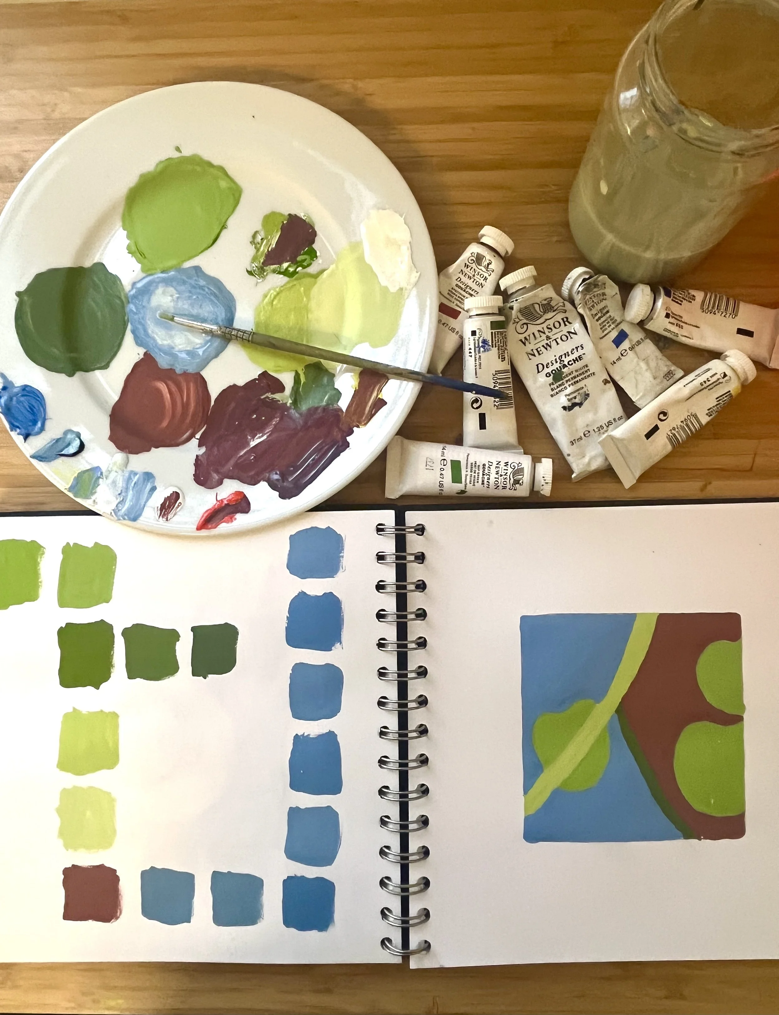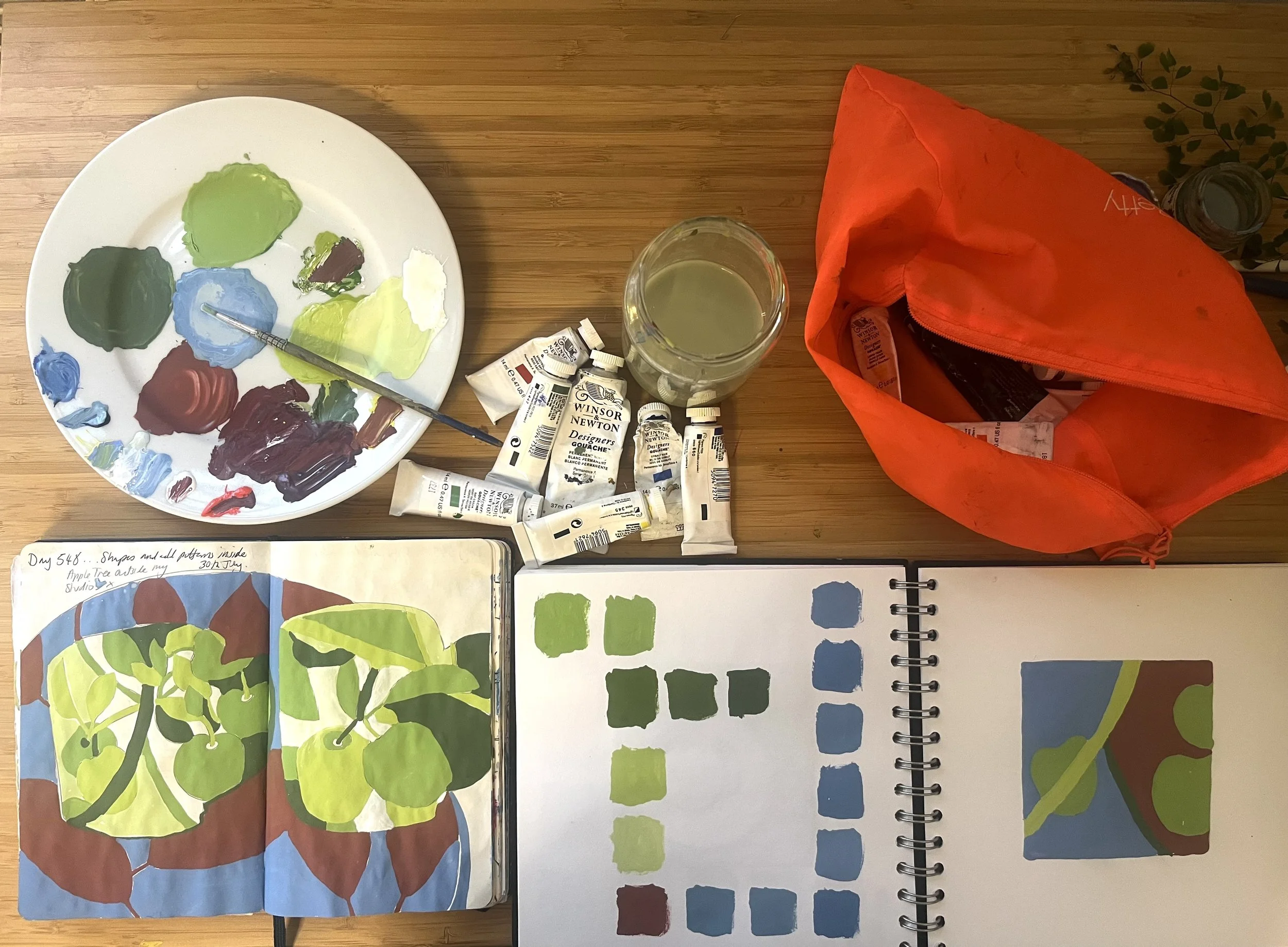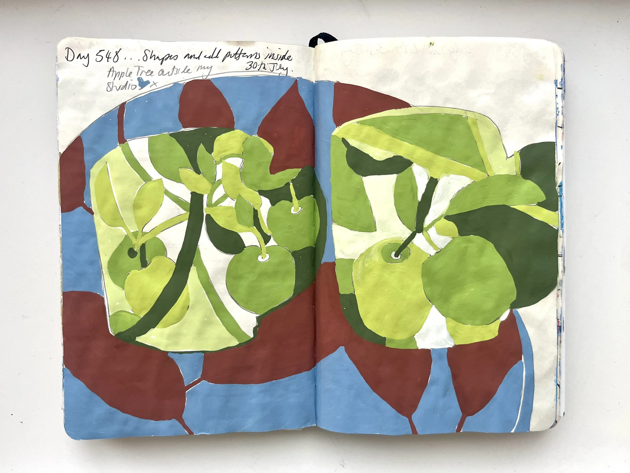 This morning the apples were still on my mind, so I finally painted Day 548 of my daily practice: shapes with patterns. I had drawn it back on the 30th of July but never painted it in. The colours came straight from the apple trees outside the studio—those greens, rust red fence and blue studio that actually lets the painting sit somewhere between summer and autumn. I updated my colour diary at the same time, which felt like bottling a little of the garden’s brightness, the same way we bottled chutney last night.
