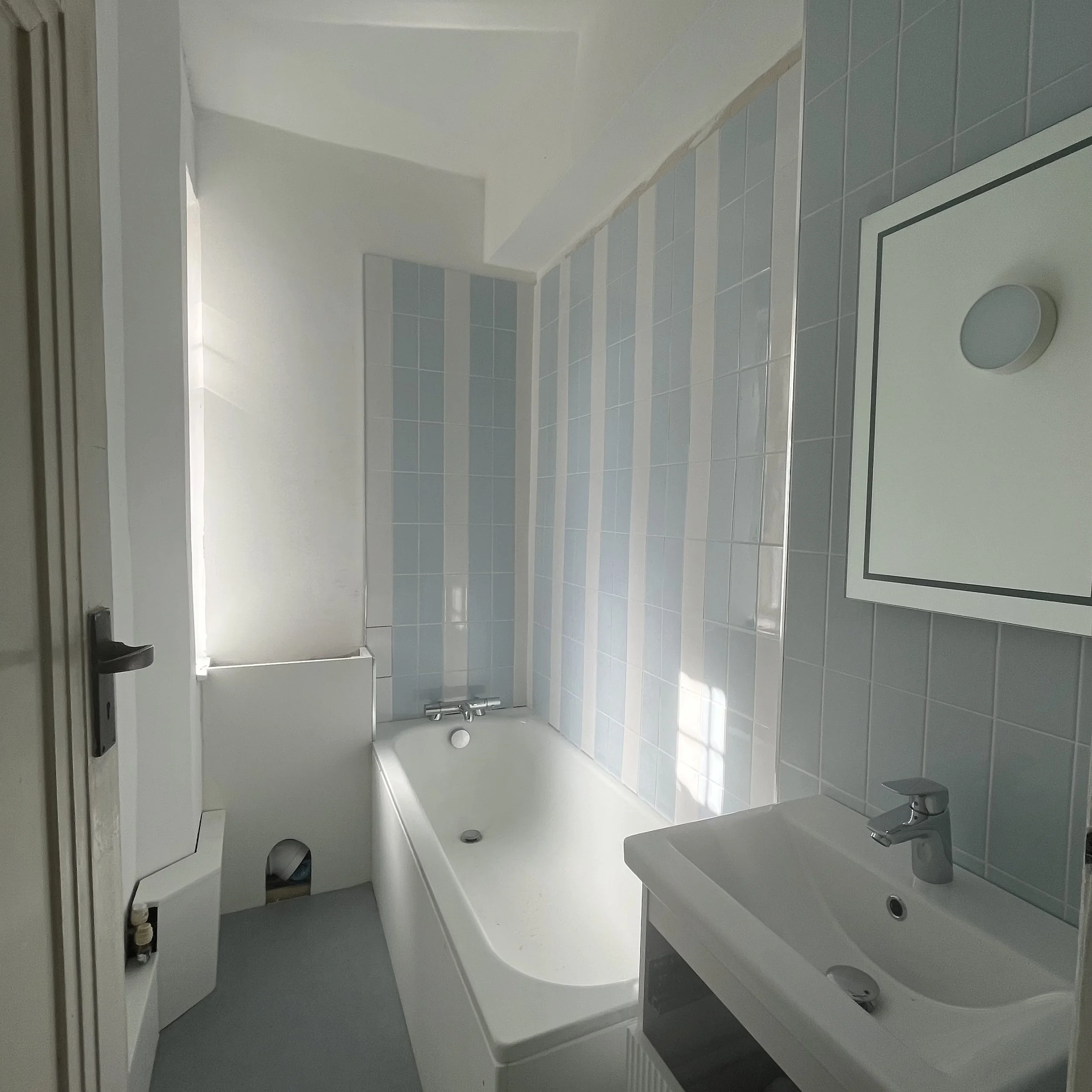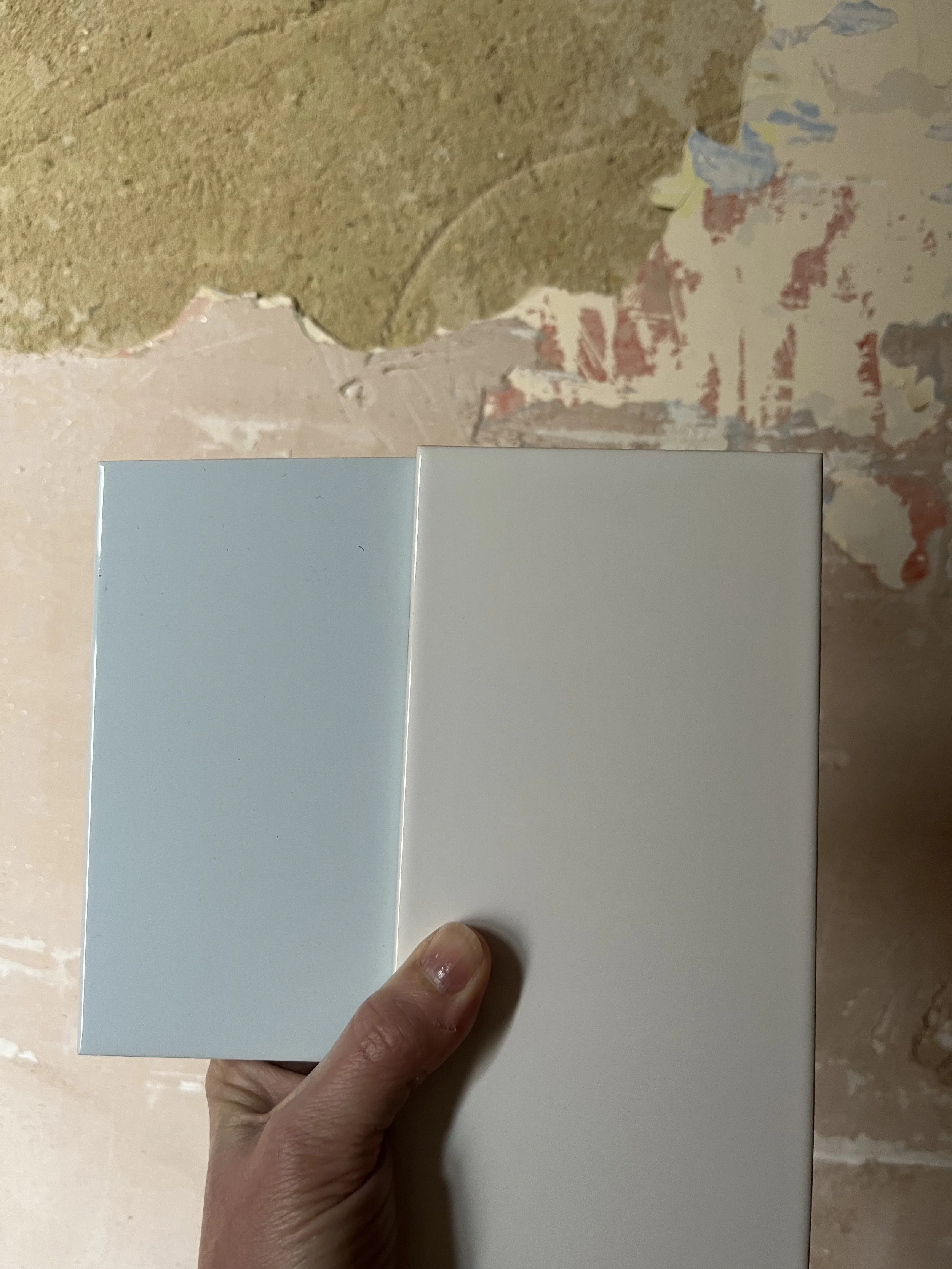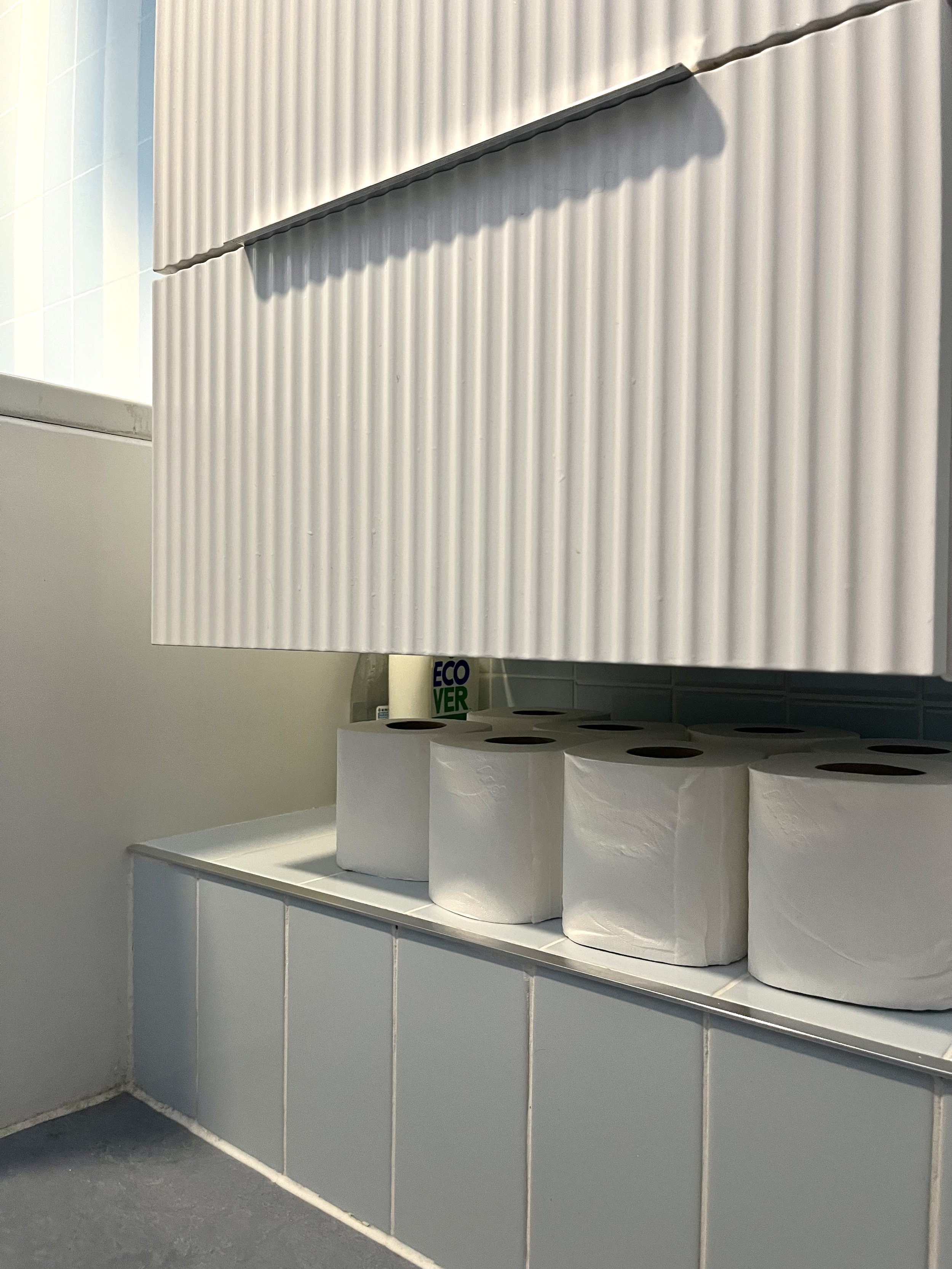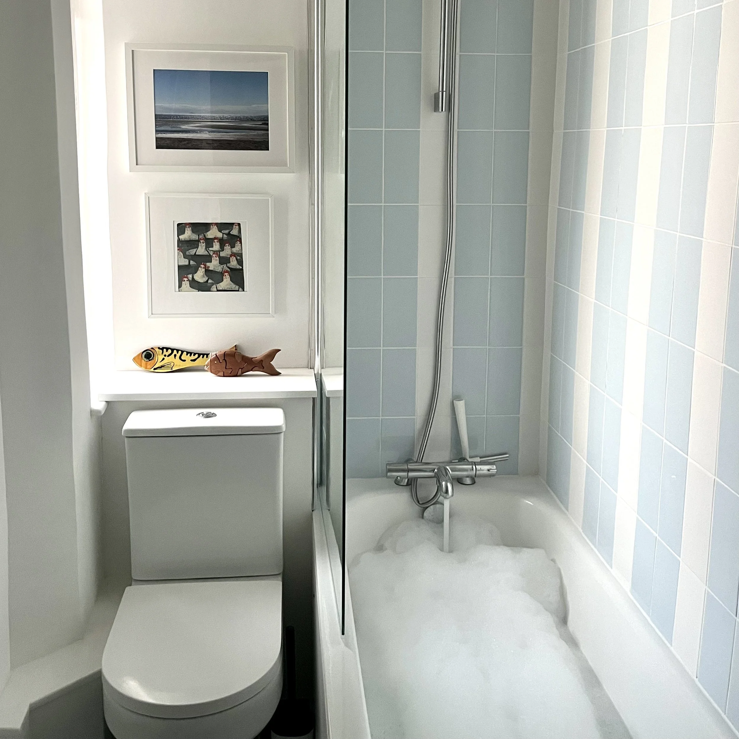 I had leftover blue tiles from a previous project, which I paired with the white to create a simple striped design - proof that reuse can still feel intentional and modern. I sourced matching white tiles made in the UK by Johnson Tiles (Prismaticsrange), allowing me to remove dated details and refresh the space without having to buy everything new.